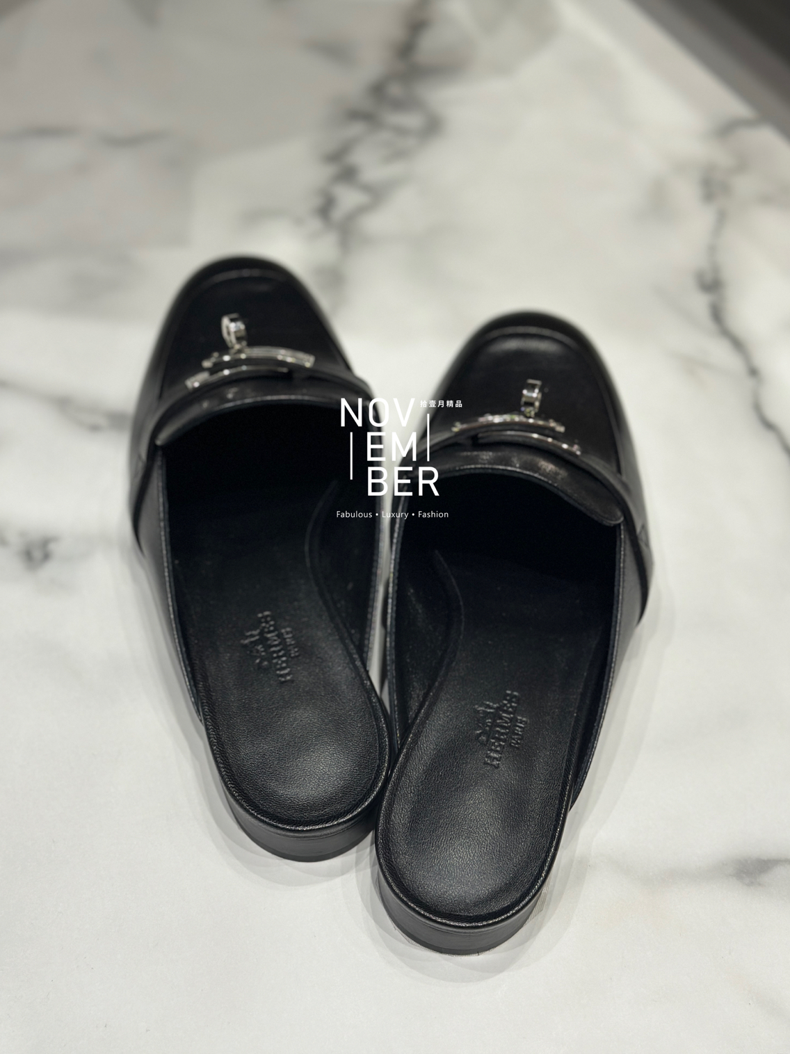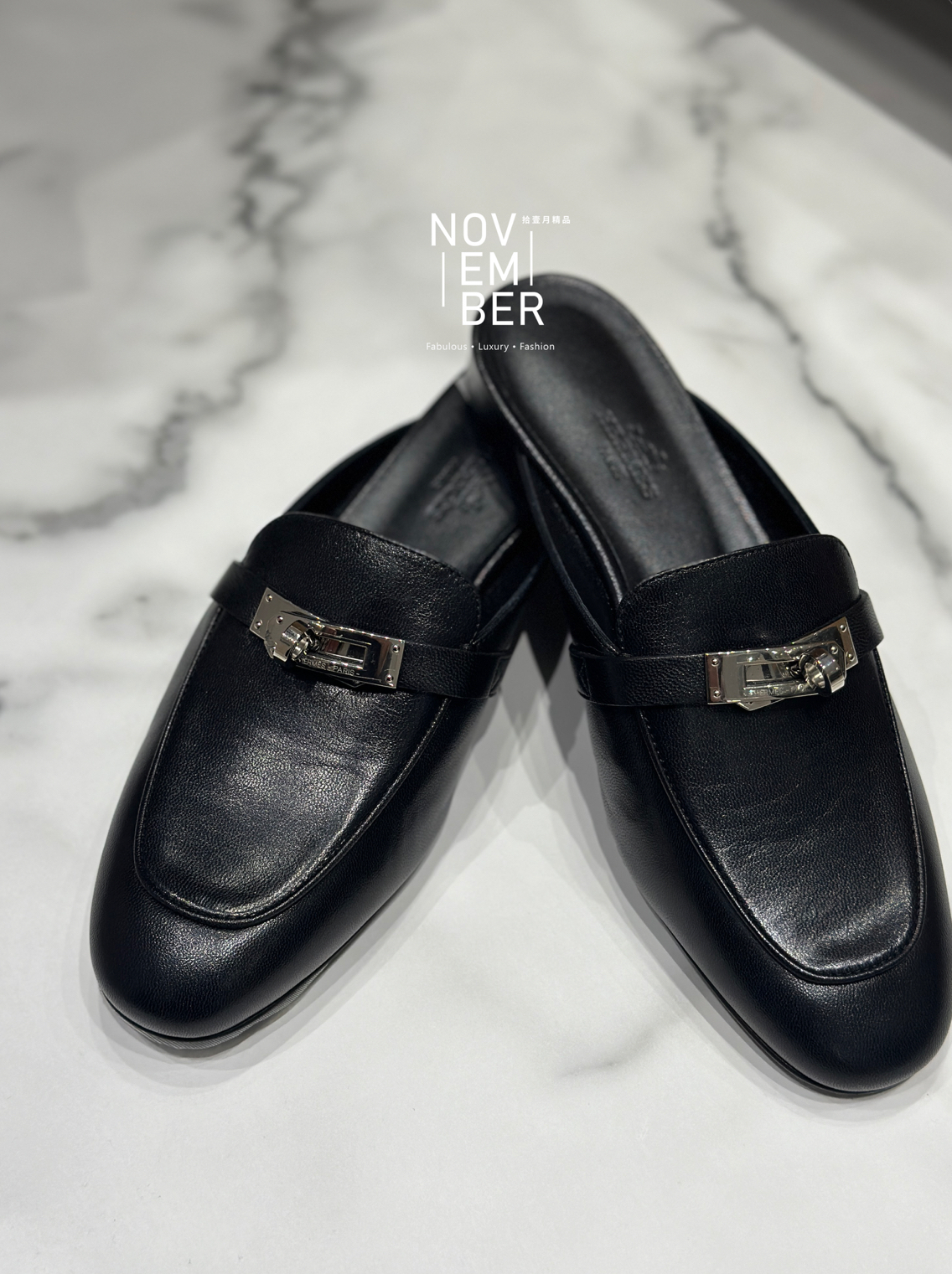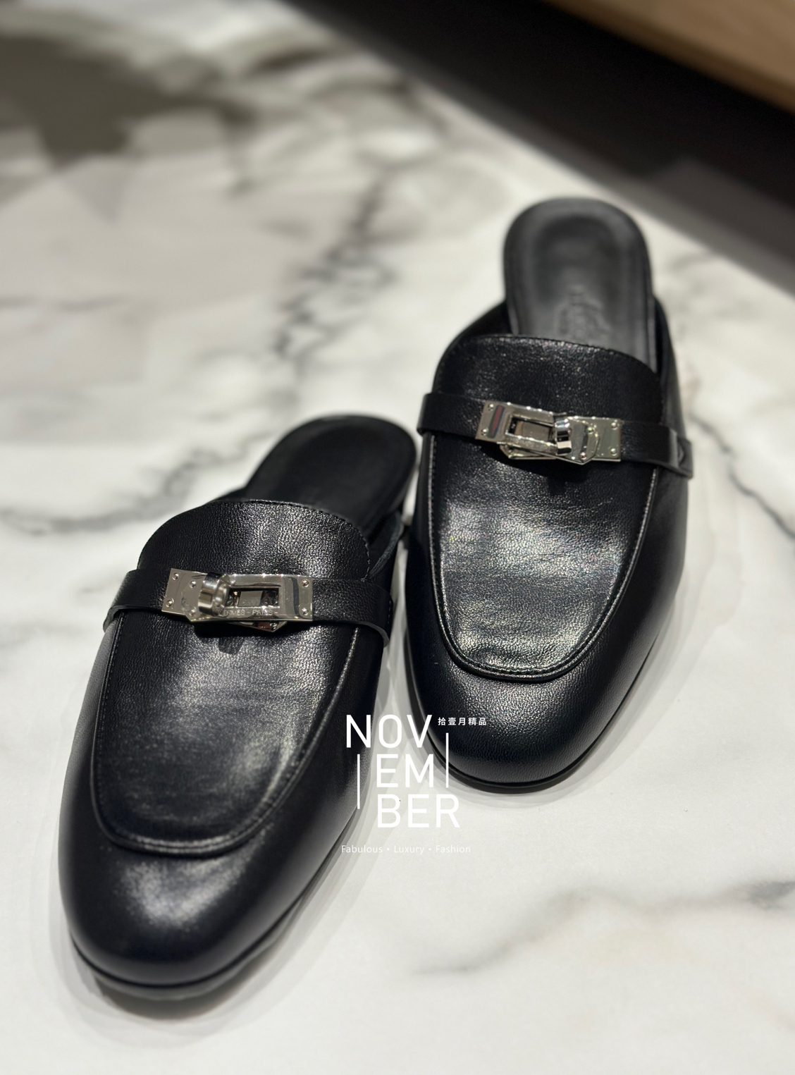 Hermes 黑色銀釦穆勒鞋